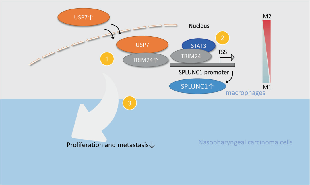 本项目从鼻咽癌远处转移这一关键临床问题出发首先探讨了肿瘤微环境中巨噬细胞在鼻咽癌转移中的作用及机制,发现USP7通过去泛素化和稳定TRIM24重编程巨噬细胞增强SPLUNC1表达,抑制鼻咽癌的生长和转移及ACSL4通过促进铁死亡和M1巨噬细胞极化抑制鼻咽癌的发生和发展。为鼻咽癌远处转移的精准化治疗提供了重要临床和机制研究基础。与中山大学肿瘤防治中心共同开展的临床研究采用替雷利珠单抗联合GP治疗复发或转移鼻咽癌,可显著缩小肿瘤,大大降低疾病进展风险,延长无进展生存期,且安全性较高;首次证实DDP(顺铂)同期放化疗联合GP(吉西他滨+顺铂)方案,较此前推出的PF(氟尿嘧啶+顺铂)方案,在辅助治疗鼻咽癌方面更具前瞻性,可使局部晚期(2-3期)鼻咽癌患者疾病死亡风险降低46%。相关成果发表于Cancer Cell、Lancet Oncol、Cell Death and Disease、International Immunopharmacology。