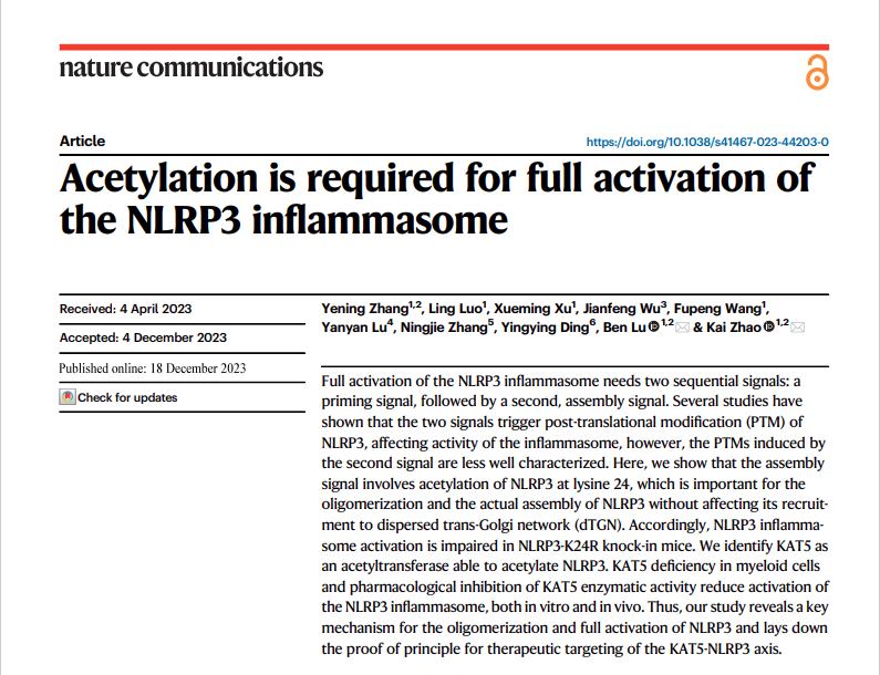 本项目发现了乙酰转移酶KAT5介导的NLRP3第24位赖氨酸(K24)乙酰化是NLRP3炎性小体活化启动的关键开关,为NLRP3炎性小体的启动机制提供了重要研究思路,也是炎症的发生发展机制的进一步延伸,同时本项目还为相关炎症疾病的治疗提供了新的靶点。该成果发表于Nat Commun。