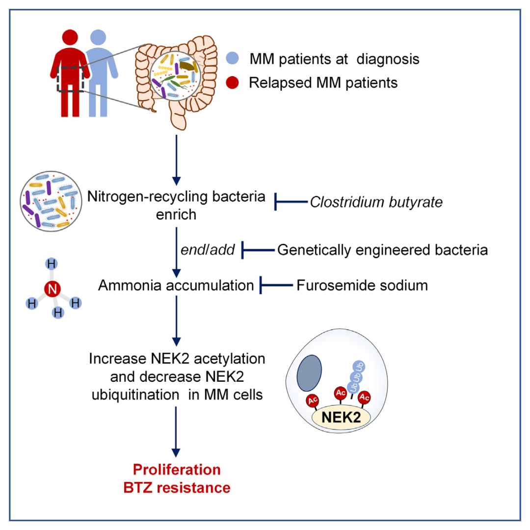 周文课题组前期研究发现骨髓微环境中氨基酸代谢失衡是多发性骨髓瘤(MM)发病和耐药的新机制,提示从代谢角度干预氨基酸来源、摄取和分解可为MM治疗提供新思路。研究首次发现氮循环肠道微生物与宿主代谢互作通过NH4+诱导多发性骨髓瘤耐药的新机制,为MM复发耐药治疗提供了新的干预靶标和临床策略。相关成果发表于Cell Metabolism、Nature Communications。