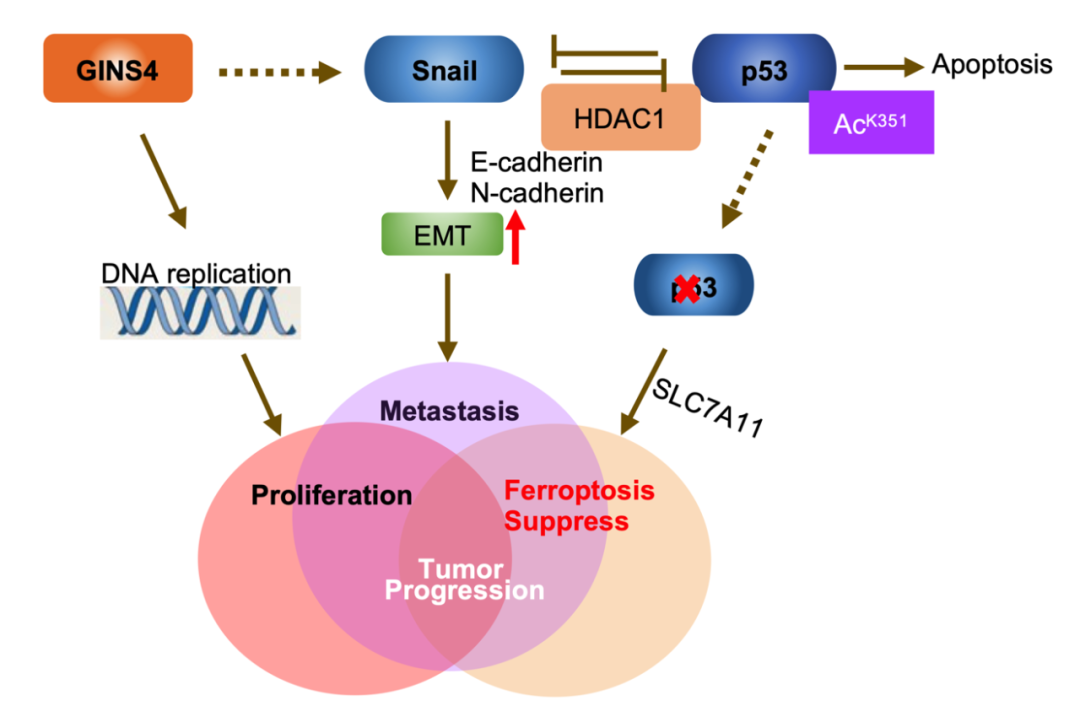 陶永光团队新近发现DNA复制起始复合物之一的GINS4可通过上调上皮间充质转化关键转录因子Snail,并与Snail相互作用,拮抗p53新乙酰化位点(K351),降低p53蛋白水平,调控铁死亡关键分子SLC7A11的表达,抑制肺腺癌发生铁死亡,且这种调控依赖于野生型p53活性。本研究成果有望加深对DNA复制与细胞命运的理解,有助于阐明细胞命运调控机制,以及了解肿瘤发病机制。团队深入详实地探究DNA复制关键分子对细胞命运的决定起着重要作用,有助于p53野生型和转移型肺腺癌治疗战略的开发。该成果发表于Proc Natl Acad Sci U S A。