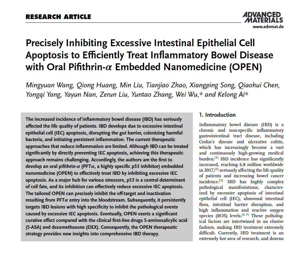 本项目首次开发了带有强负电荷的硫酸软骨素功能化钽迈克烯纳米药物(TACS),有优越的CT成像功能。因IBD病灶带有正电荷和高表达CD44配体,经口服后TACS能靶向IBD病灶,从而大幅提高IBD的CT成像灵敏度和诊断准确率。在此基础上,进一步开发了带负电荷装载装载p53抑制剂的黑色素(OPEN)纳米复合药物,口服后靶向抵达IBD病变区,持久缓慢释放药物,抑制异常上皮凋亡显著增强治疗效果。相关成果在Adv. Mater上发表2篇论文,Small上发表1篇论文,获国家发明专利2项。