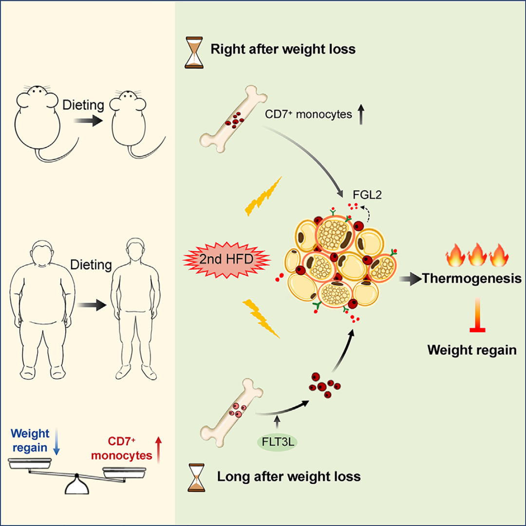罗湘杭研究团队提出了“骨髓免疫控制体重反弹”策略,鉴定了一群响应营养波动的骨髓CD7+单核细胞亚群并解析其在对抗体重反弹中的作用机制。本项目聚焦于骨髓免疫细胞亚群,揭示了免疫细胞对代谢性疾病的关键调控作用,为代谢性疾病的治疗提供新的治疗靶点和方法。相关成果发表于Cell Metabolism、Nature Communications。