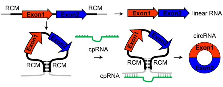 之前的研究者发现,在circRNA生物发生的过程中,其两侧的反向互补匹配序列(Reverse Complementary Matches)不可或缺,RCMs的形成使剪接位点更靠近,从而促进circRNA的形成。本研究基于RCMs促进circRNA环化的机制,发明了一种促进circRNA生物发生的新方法。通过对特定circRNA侧翼序列设计一种寡核酸单链,我们称之为circRNA promoting RNA (cpRNA),cpRNA旨在拉近pre-mRNA中反向互补匹配(RCMs)的侧翼序列,增强circRNA侧翼内含子的稳定配对,使形成circRNA的pre-mRNA的末端更紧密地结合在一起,从而促进外显子的环化,达到增加特定circRNA表达的效果。该研究为体内操控circRNA表达提供的一种新方法,同时也为基于circRNA的基础研究和转化研究提供了新思路。