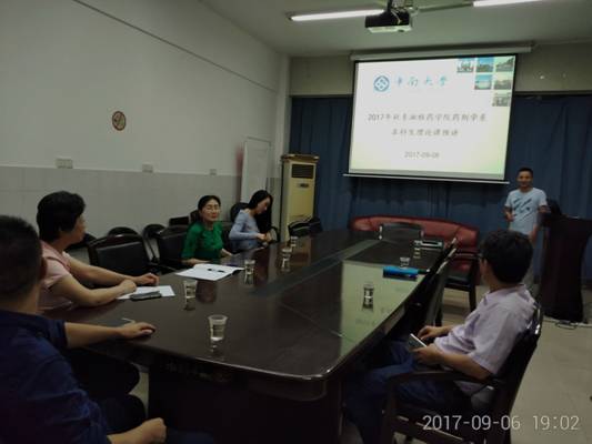药剂学教研室在孝骞楼626办公室举行了2017学年秋季学期本科生理论课预讲活动。刘珍宝老师、周文虎老师参与了本次本科生理论授课预讲,授课内容分别为《溶液的形成理论》、《固体分散体的制备技术》。本次活动由药剂学系主任丁劲松教授主持,系副主任陈传品教授、姚瑶副教授,柳文洁老师,吴建平老师,贺凌云老师及教学秘书袁玉老师到场指导。