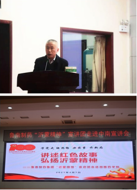 沂蒙精神源于沂蒙山区,源于中国共产党军民在抗战和解放战争时期一个个可歌可泣的动人故事。2013年11月,习近平总书记视察山东时指出“山东是革命老区,有着光荣传统,军民水乳交融、生死与共铸就的沂蒙精神,对我们今天抓党的建设仍然具有十分重要的启示作用”。宣讲团以沂蒙精神为主线,以详实的历史资料、生动的情景再现和感人的角色扮演,演绎了党群心连心《沂蒙精神的形成》、拥军勇支前《沂蒙红嫂》、日月换新天《沂蒙精神在新时期的传承》、时代谱新篇《时代楷模赵志全》四个篇章,鲜活地再现了从战争年代到和平年代,沂蒙人民意志坚定跟党走,吃苦耐劳、勇往直前的伟大壮举,全方位地呈现了沂蒙浓浓的红色基因和厚重的时代价值。身处沂蒙腹地的国家级重点高新技术企业——鲁南制药集团多年来以沂蒙精神为依托,坚守“造福社会,创造美好生活”的企业经营宗旨,攻坚克难,砥砺发展,是沂蒙精神融入新时代发展的生动写照。
