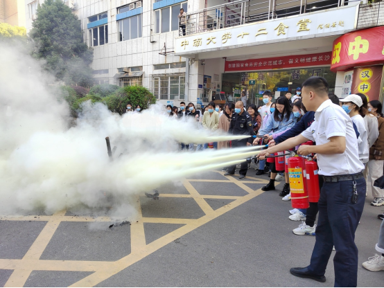在宣讲最后,教室外突然升起一股浓烟,紧急演练在骤不及防中开始。老师和学生们按照刚才所学有序“逃生”,然后来到在教室外开始亲手演练器材操纵、灭火方法等。