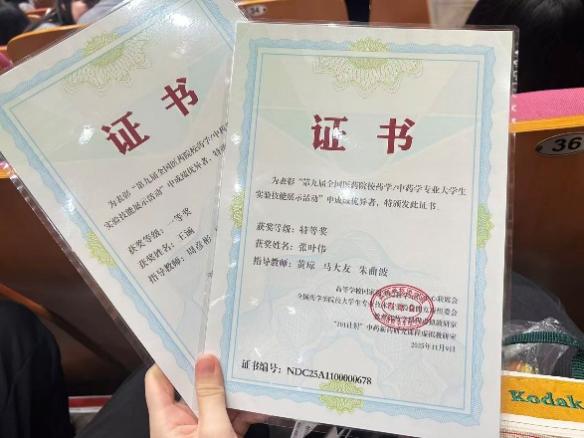 选派的两名参赛选手张叶伟(药学专业)和王涵(临床药学专业)凭借其出色的理论基础、规范的实验操作和突出的综合能力,在激烈的竞争中脱颖而出,分别荣获特等奖和一等奖。