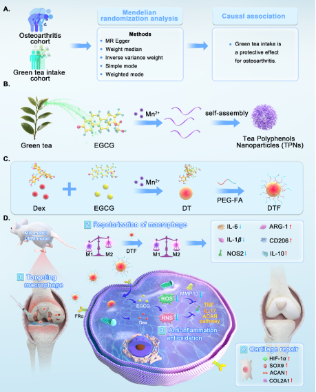 针对这一治疗困境,研究团队开创性地将人类遗传学证据与纳米药物设计相结合,提出全新研发策略。通过对超过47万人的遗传数据进行孟德尔随机化分析,研究首次在因果关联层面证实了“饮用绿茶可降低OA风险”。这一关键发现,将绿茶中的核心活性成分——表没食子儿茶素没食子酸酯及其自组装形成的茶多酚纳米颗粒,确立为极具潜力的治疗候选“基石”。