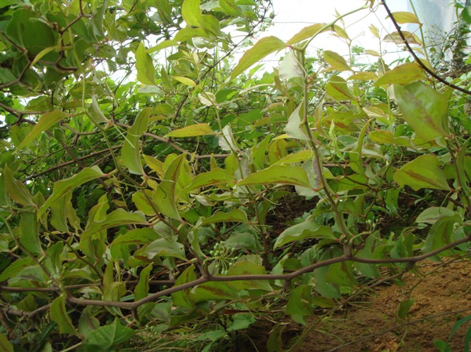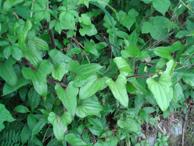 菝葜Smilax china L. :又名金刚藤。百合科菝葜属。根茎叶均可入药,有祛风利湿,解毒消肿之效。根状茎:治风湿关节痛,跌打损伤,胃肠炎,痢疾,消化不良,糖尿病,乳糜尿,白带,癌症;叶:外用治痈疖疔疮,烫伤。
