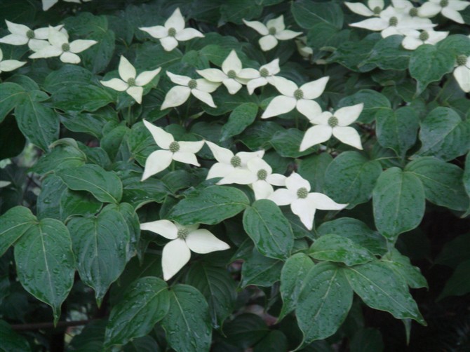 四照花Cronus japonica var.chinensis :别名山荔枝,山茱萸科四照花属。四片白色苞片美观而显眼,颇富观赏价值,聚花果味甜可食,可酿酒。木材坚硬,可作农具或工具柄,花、叶、果实入药。主治烧伤、肝炎。