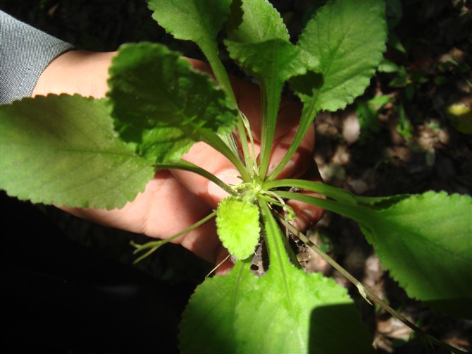 鳢肠Eclipta prostrata L. 又名旱莲草,墨草,菊科鳢肠属。幼苗子叶椭圆形或近圆形,初生叶2个,成株茎从基部和上部分枝,直立,被伏毛,叶对生,无柄或基部叶具柄,全缘或具细锯齿。头状花序顶生或腋生,植株断面有汁液渐变黑。全草入药,有凉血、止血、滋补肝肾、清热解毒之效。