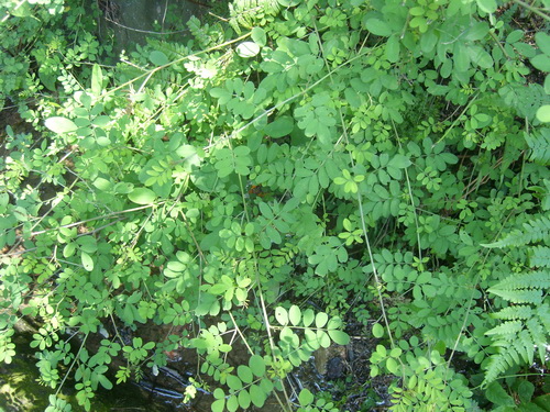 马棘Indigofera pseudotinctoria Mats 豆科木篮属。半灌木,小枝被丁字毛。羽复互生,小叶9-11,先端微凹,基部圆楔形,总状花序直立,腋生,蝶形花冠红紫色。荚果圆柱形。以根或全株入药,有清热解毒,消肿散结之效。用于感冒咳嗽,扁桃体炎,颈淋巴结结核,小儿疳积,痔疮;外用治疔疮。