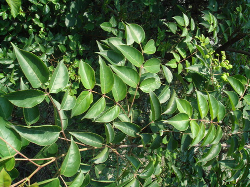 野鸦椿Euscaphis japonica (Thunb.)Dippel,省沽油科野鸦椿属落叶小乔木或灌木,小枝及芽棕红色,枝叶揉碎后发恶臭气味。单数羽状复叶对生;小叶7~11,对生,边缘具细锯齿,厚纸质。圆锥花序顶生;花黄白色,蓇葖果,果皮软革质,紫红色。种子近圆形,假种皮肉质,黑色。其根有解表,清热,利湿之效。用于感冒头痛,痢疾,肠炎。果有祛风散寒,行气止痛之效。用于月经不调,疝痛,胃痛。