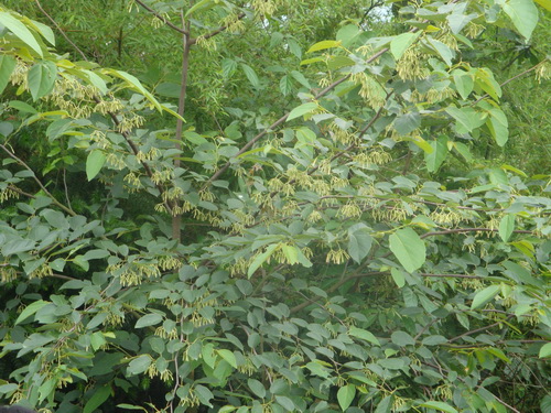 扁担杆子Grewia biloba G.Don 别名:棉筋条,山络麻,狗糜子,扁担格子。椴树科扁担杆子属落叶灌木。叶菱状卵形或菱状披针形,先端锐尖,基部圆形到阔楔形,叶表几无毛,叶背疏生星状短柔毛,基脉三出,缘具重细锯齿,叶柄短,被柔毛,托叶条形,宿存,聚伞花序与叶对生,两性花,有花5-8朵。花淡黄绿色,萼、瓣均5数,核果红色无毛光亮,2-4裂,似人拳。树形优美,耐旱性强,是园林绿化中一个良好的灌丛树种,茎皮纤维柔韧洁白,为上好的纤维原料。