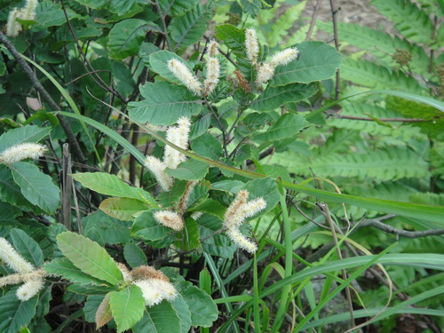 板粟Castanea mollissima Blume 壳斗科栗属。单叶互生,椭圆或长椭圆状,边缘有刺毛状齿。雌雄同株,雄花为直立柔荑花序,雌花单独或数朵生于总苞内。坚果包藏在密生尖刺的总苞内。果实与桃、杏、李、枣并称“五果”。属于健胃补肾、延年益寿的上等果品。