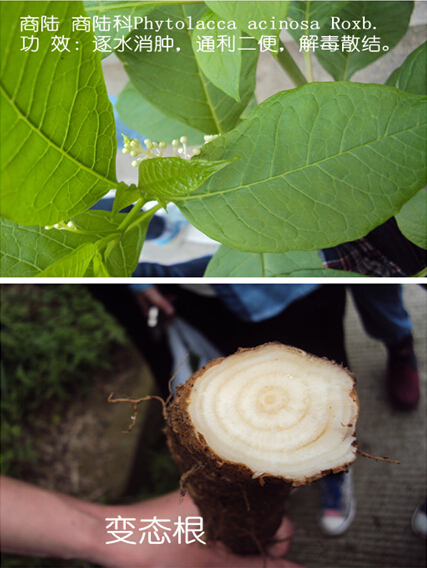 一下子,我们便开始七言八语讨论开来...见我们猜测的什么都有,老师就开始解释道,“它就是商陆了,市场上经常用它的根来冒充人参,不过它自己也是一种生药,商陆科,属多年生粗壮草本植物。根肥厚,肉质,圆锥形。叶卵圆形,全缘。夏秋开花,花白色,总状花序。浆果扁球形,紫黑色。药用部位是干燥根,可以逐水消肿,通利二便,解毒散结;外治痈肿疮毒。”听着老师的详细解释,我们一边拍照,一边在记录本上写下我们发现的第一种药用植物——商陆,出于对它如何冒充人参的好奇,在上山的路上,我还特意挖出了它的根,不过,望着它那粗壮、肉质肥厚的根,我实在很难想象,它是怎么瞒过人们的双眼在市场上冒充人参的?切开根,它的横切面是一圈圈的同心圆花纹,它就是我们在书本上学过的异常维管束。