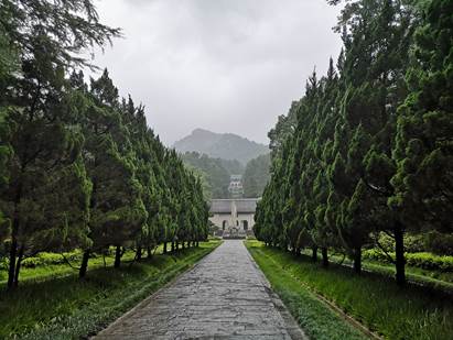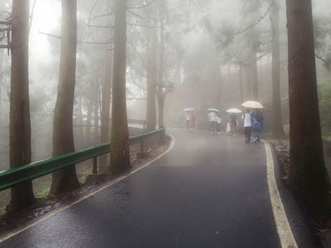 大巴只能到达山下景区停车场,基地安排了一辆面包车拖行李,从停车场到入门处再到基地,全靠徒步。雨中的衡山,被白雾拢罩,缥缈而迷茫,为赶在午饭前安顿好住宿,腾出下午的时间开始学习,学生们被要求以组为单位在带队老师的带领下埋头赶路。