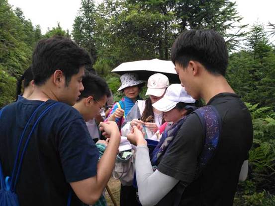 湘雅医院药学部主任药师曾老师在指导学生观察植物细节,根据特征定科属种。