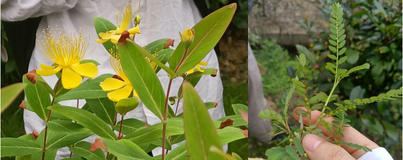 为期两天的野外采药活动可谓收获满满。全套防晒,草帽一带,水壶一挎,各组小分队在老师带领下向野外进发。第一天老师主要带着我们沿着田垄观察四周的植物,从刚出门的台阶下就开始了讲解。还在构想着实践活动具体是如何开展的我转头就被灌了一脸知识,老师指导着我们观察植物的花、叶、茎……“这就是藤黄科的金丝桃,它含有的金丝桃苷有抗抑郁的作用”,生药学考试时复习的知识点涌上心头,书本上黑白相间的字眼生动形象的呈现在眼前,不由得产生一种原来就是它的感慨。待我们稍做笔记之后老师又指导着我们用触觉和嗅觉感知另一种植株,仔细聆听的我们跟随着老师的讲解翻看着叶子的正反面,上手摸了摸它的茎,又扯下几片叶子凑在鼻尖闻了闻,熟悉的清凉感扑鼻而来“有白色的毛,茎是四棱形的,是薄荷!”我们一边感知一边回答着,茎四棱,叶对生,一点点的同药用植物学中总结的唇形科植物的特点对应起来。当我们投身到了实践之中,所学的知识不再拘泥于课本,我更加深刻地感受到了所学知识的真正意义,它们不仅仅是印刷在书本上的普通汉字,一个个的知识点,更是一株株生命力顽强的植株,是可以鉴别出来的治病救人的药材。随后我们跟随着老师见识到了叶下挂果的叶下珠、到了夏季就开始枯萎的夏枯草……从田垄土沟走到山坡高地,烈日一路相伴,挎包里带的水也喝得差不多了,每一个人都是汗如雨下。酷热、疲惫是大家最直观的感受,满满一袋子的植物,以及脑子里循环播放的各种刚学知识的碎碎念则是大家来之不易的收获。