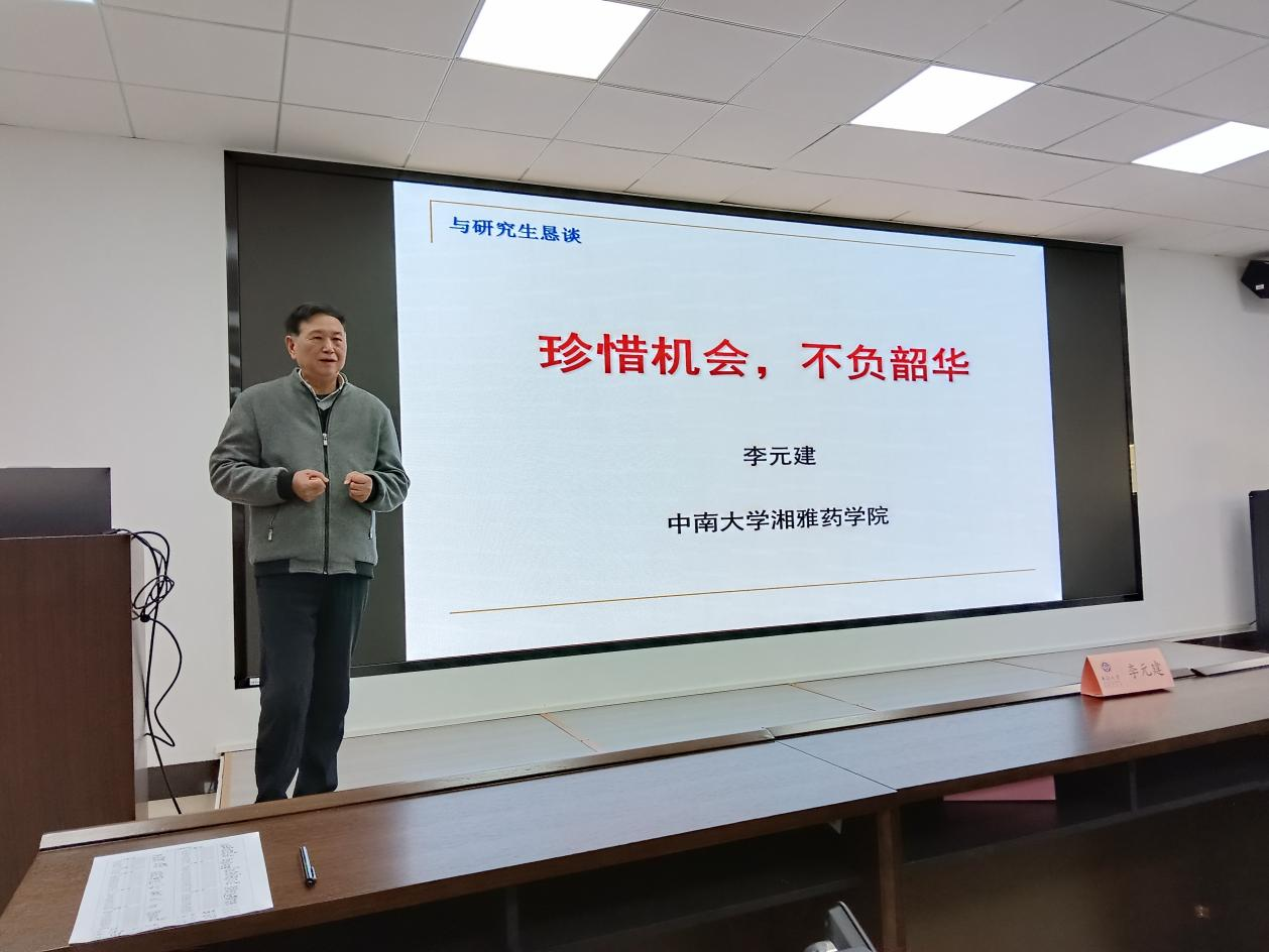 原院长、博士研究生导师李元建教授为药学院今年新入学的研究生及学院学生代表做“珍惜机会,不负韶华”专题讲座,胡平安书记、唐媛副书记、桂玲智主任出席。